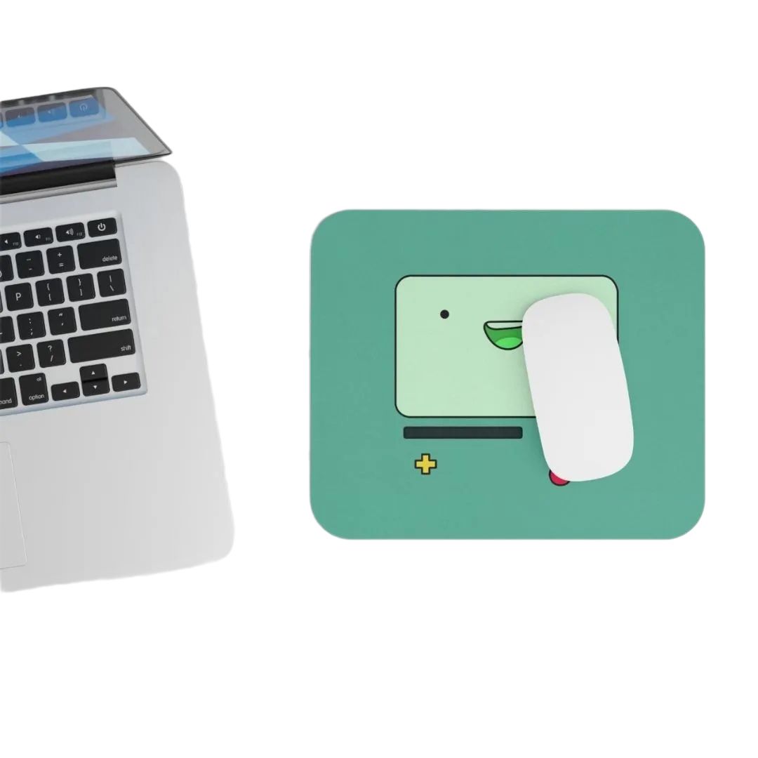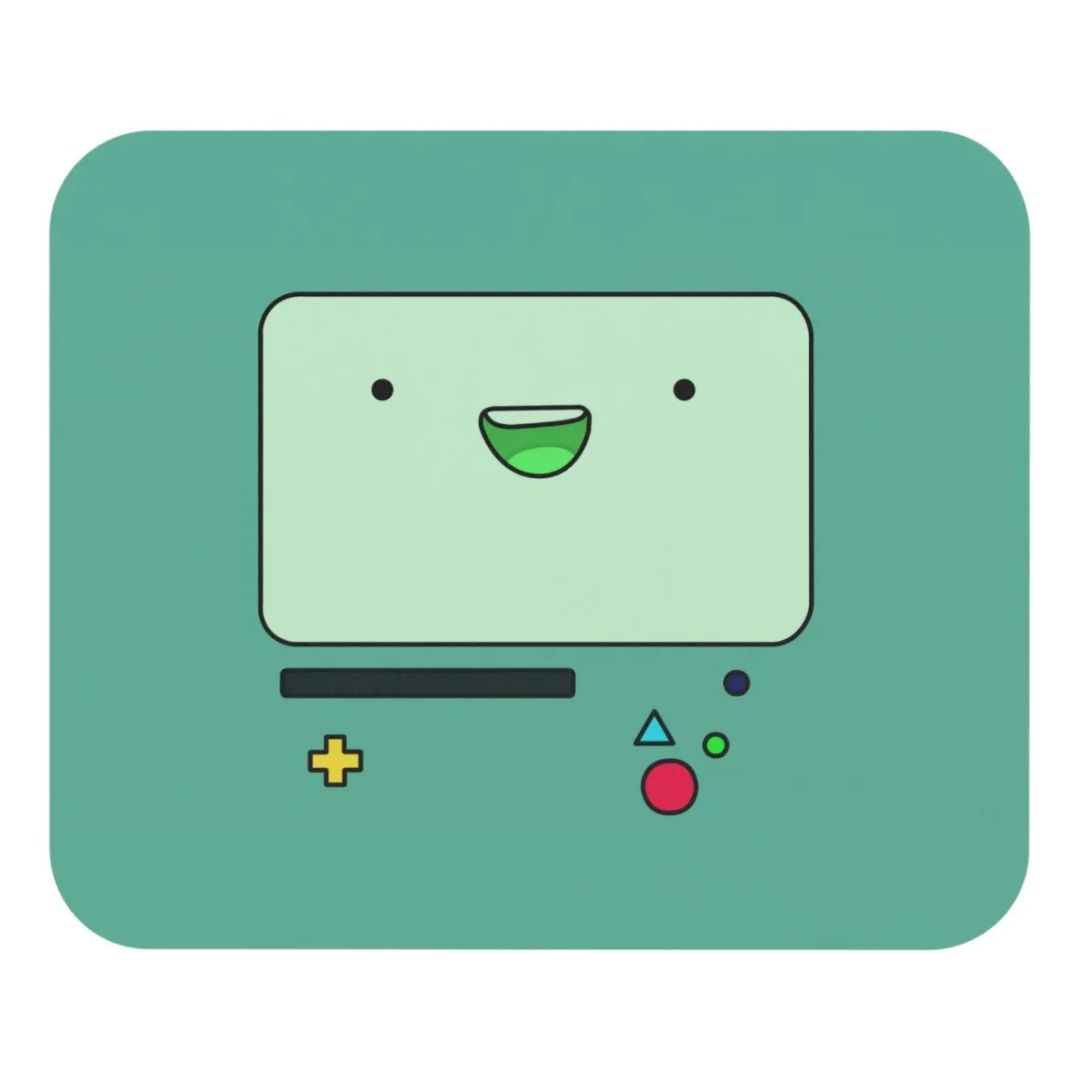 Mouse pad con diseño inspirado en Bmo de Hora de Aventura. Ideal para fanáticos de la serie animada que desean agregar un toque original a su espacio de trabajo o zona de juego.