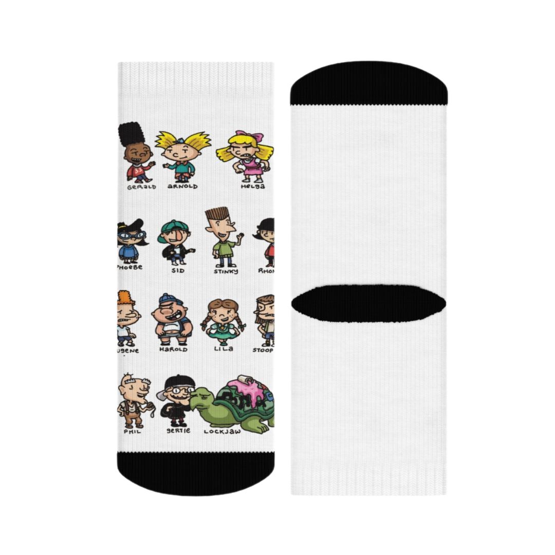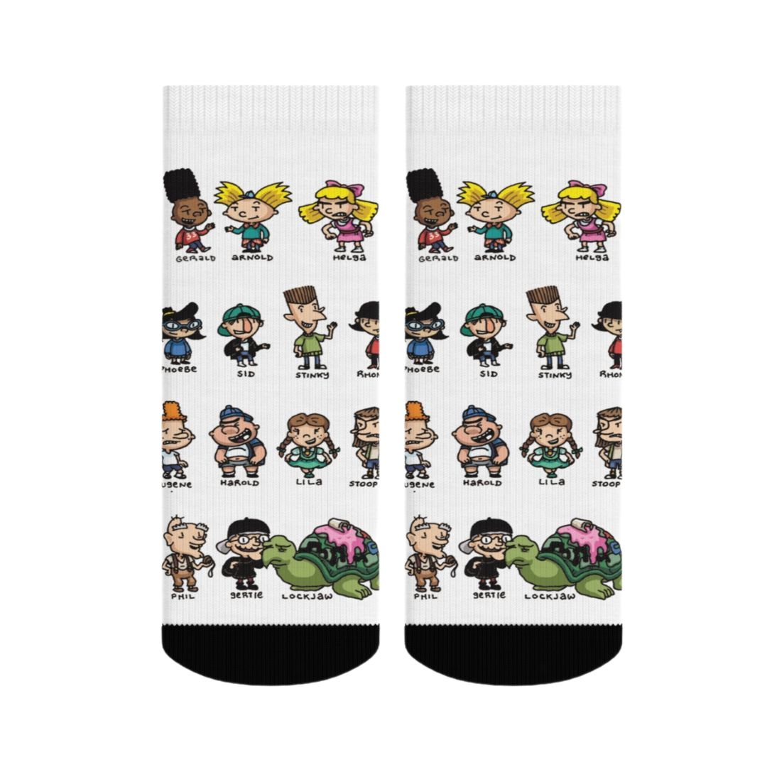Lleva contigo el estilo clásico de la serie animada ¡Oye Arnold! con este par de calcetines cortos que presentan a sus personajes más representativos como Arnold, Helga, Gerald y Stinky, entre otros.