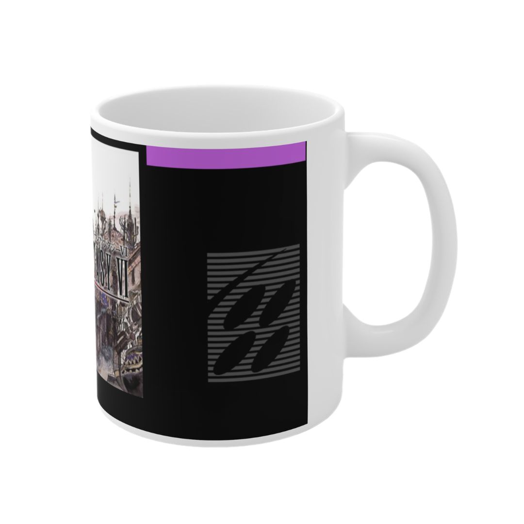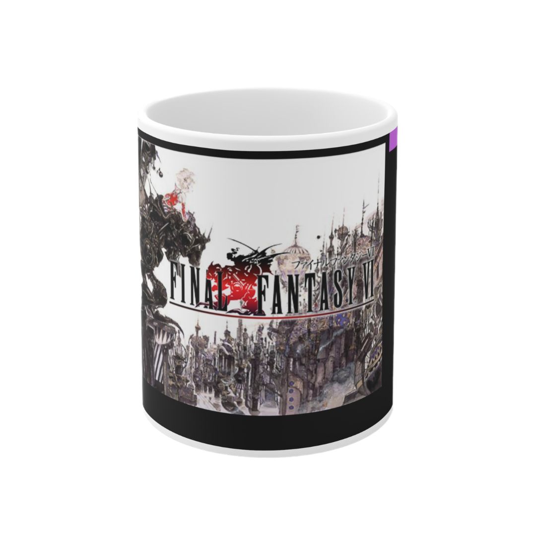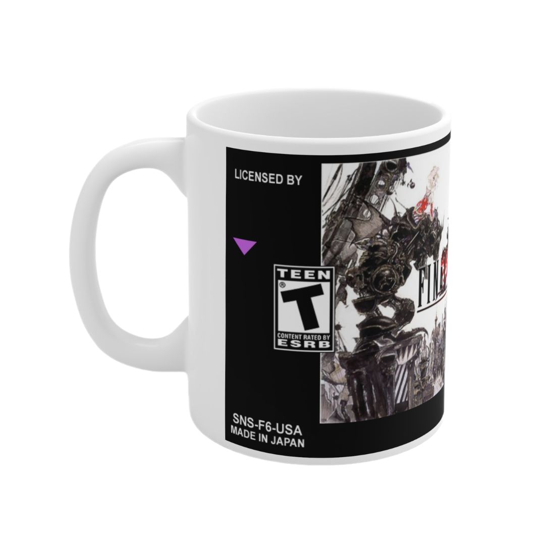 Esta taza del videojuego Final Fantasy VI presenta un diseño inspirado en la etiqueta original del cartucho de SNES del clásico desarrollado por Square, evocando la estética retro que marcó a toda una generación.
